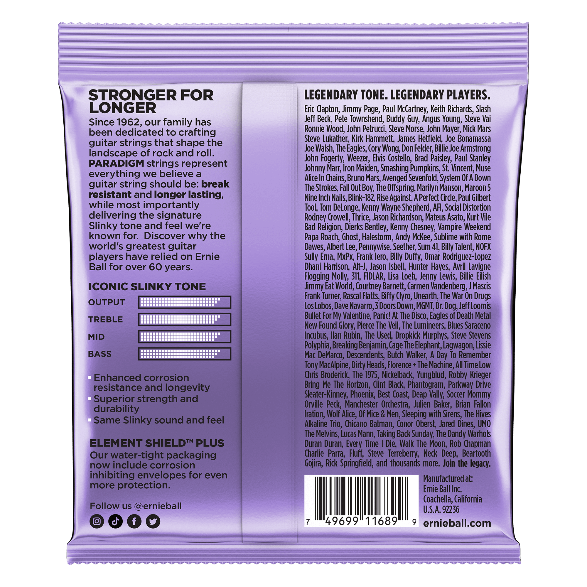 Ernie Ball Slinky Paradigm Electric guitar strings provide unprecedented strength and longer life while retaining 100% Slinky tone and feel. Ernie Ball's industry leading ultra-high strength steel is included in both the wound and plain strings along with a patented reinforcement at the ball end twist of each plain string to provide superior tensile and fatigue strength for strings that lock into tune fast and hold up under the most stressful playing styles and conditions. The coupling of Ernie Ball's Everlast nanotreatment with breakthrough plasma enhanced wrap wire provides added corrosion resistance and reduced accumulation of tone-robbing buildup and debris. Experience the first set of longer lasting strings that are worth playing with all benefits and no compromises. Gauges .011, .014, .018p, .028, .038, .048