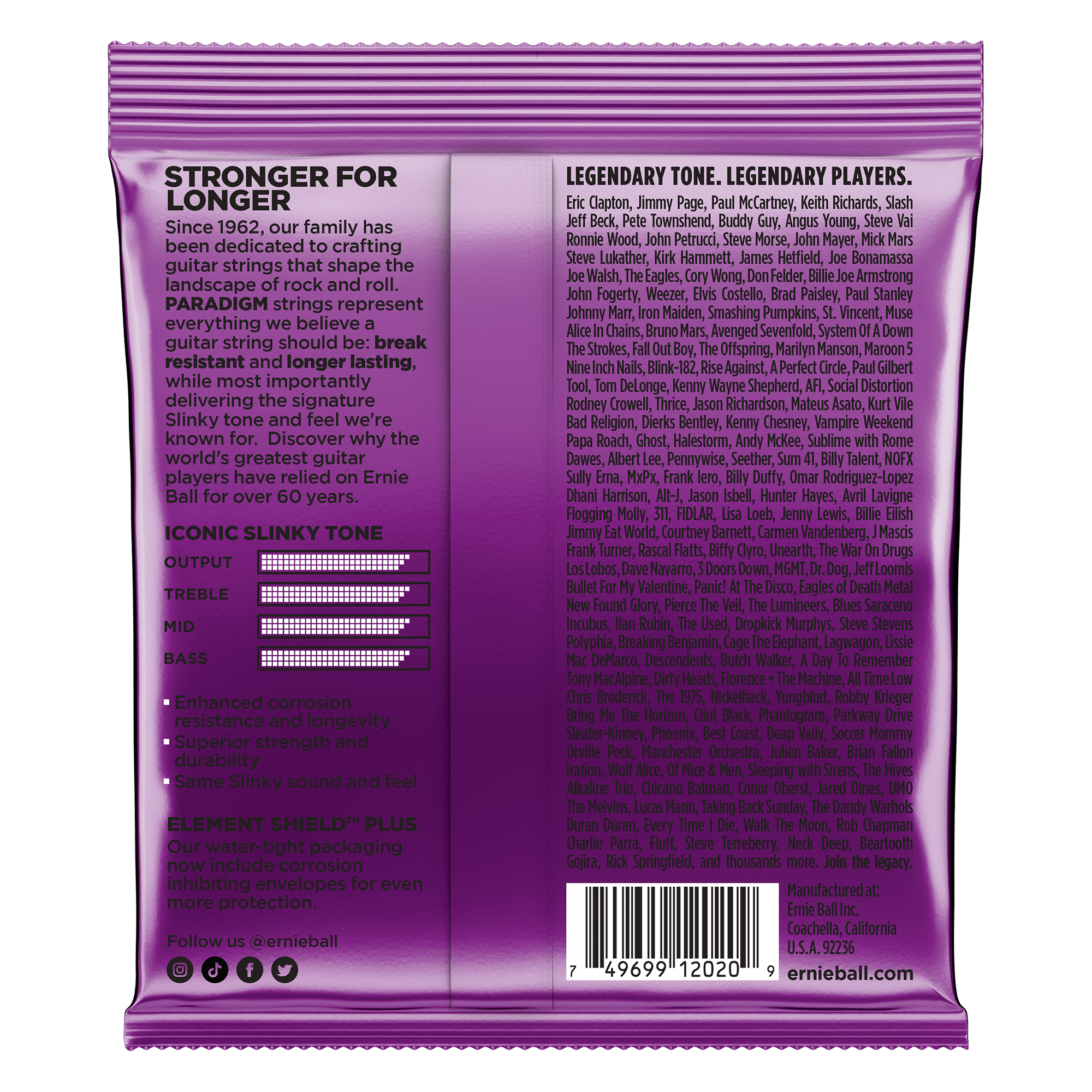A Paradigm Slinky a világ leginkább szakadásbiztos húrja. GARANTÁLJUK. A Paradigm Electric Slinky szettek példátlan tartósságot és hosszabb élettartamot biztosítanak miközben 100%-osan nyújtják a megszokott Slinky hangot és érzetet.Az iparágban vezető, az Ernie Ball által használt ultraerős acélt mind a sodrott mind pegig a sima húrok esetében használjuk, együtt a szabadalmaztatott RPS technológiával minden sima húron annak érdekében, hogy a nyújtásból és elfáradásból eredő hangolódást megszüntessük. Ezek a húrok hamarabb behangolódnak és tartják a hangolást a legádázabb körülmények és legszélsőségesebb játékmódok közben is. Az Ernie Ball Everlast nanobevonatának és a plazmakezelt tekercselésnek a kombinálása minimalizálja a rozsdásodásra hajlamosságot és megakadályozza a hanggyilkos lerakódásokat a húrközökben. Tapasztald meg az első olyan szettet ahol a hosszantartó élményt nem kell kompromisszumokhoz kötnöd.A húrok átmérője .011 .014 .018p .028 .038 .048