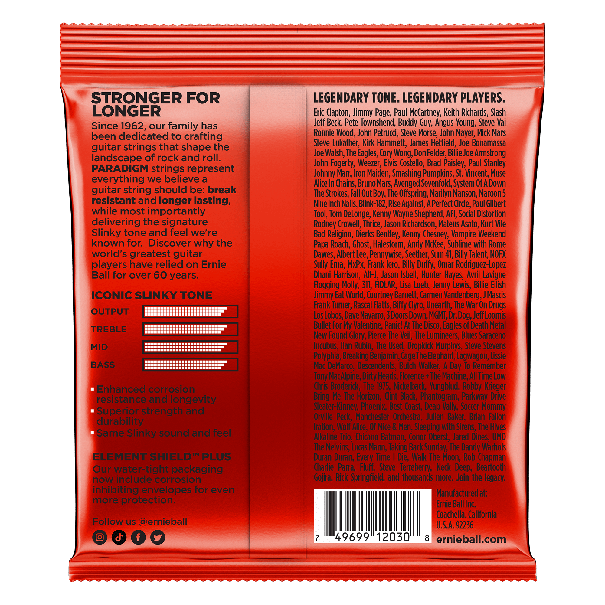 A Paradigm Slinky a világ leginkább szakadásbiztos húrja. GARANTÁLJUK. A Paradigm Electric Slinky szettek példátlan tartósságot és hosszabb élettartamot biztosítanak miközben 100%-osan nyújtják a megszokott Slinky hangot és érzetet.Az iparágban vezető, az Ernie Ball által használt ultraerős acélt mind a sodrott mind pegig a sima húrok esetében használjuk, együtt a szabadalmaztatott RPS technológiával minden sima húron annak érdekében, hogy a nyújtásból és elfáradásból eredő hangolódást megszüntessük. Ezek a húrok hamarabb behangolódnak és tartják a hangolást a legádázabb körülmények és legszélsőségesebb játékmódok közben is. Az Ernie Ball Everlast nanobevonatának és a plazmakezelt tekercselésnek a kombinálása minimalizálja a rozsdásodásra hajlamosságot és megakadályozza a hanggyilkos lerakódásokat a húrközökben. Tapasztald meg az első olyan szettet ahol a hosszantartó élményt nem kell kompromisszumokhoz kötnöd.A húrok átmérője .010 .013 .017 .030 .042 .052 .062