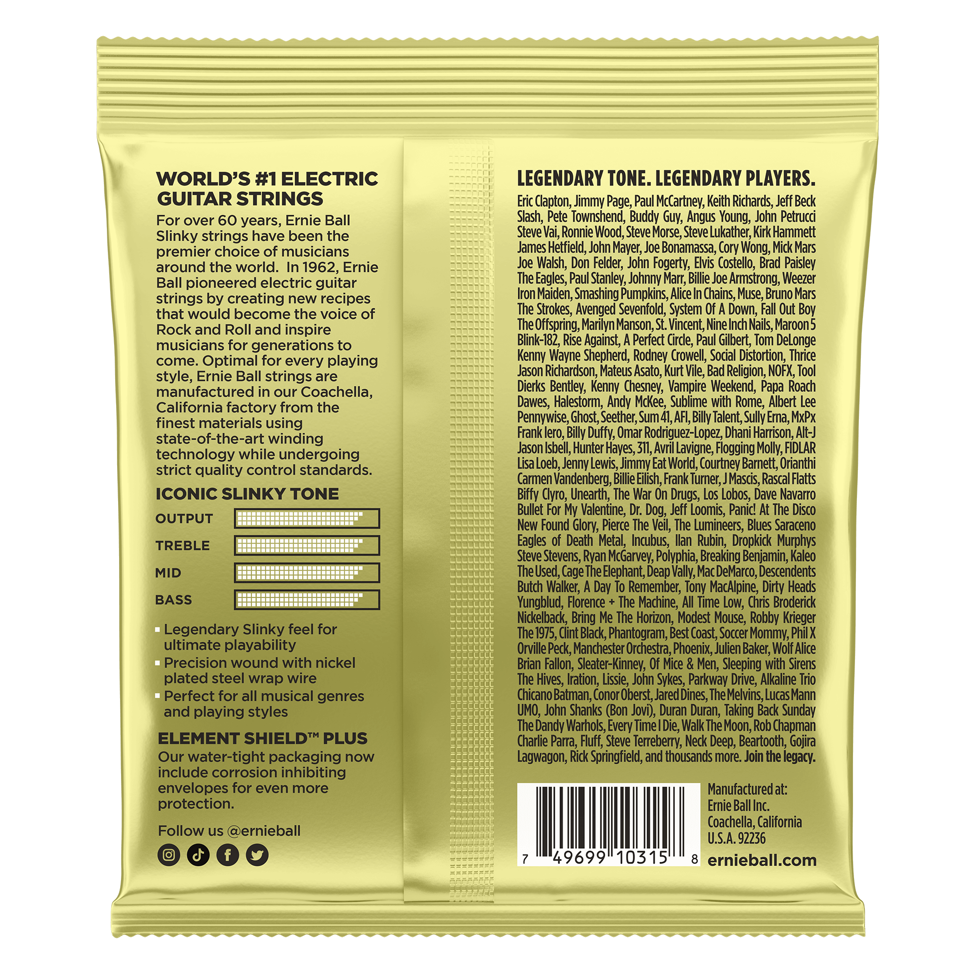 AssemblyErnie Ball single strings are coiled and packaged individually in order according to specific Slinky gauge requirements. The Slinky sets are then processed and flow wrapped in air tight individual foil packs.