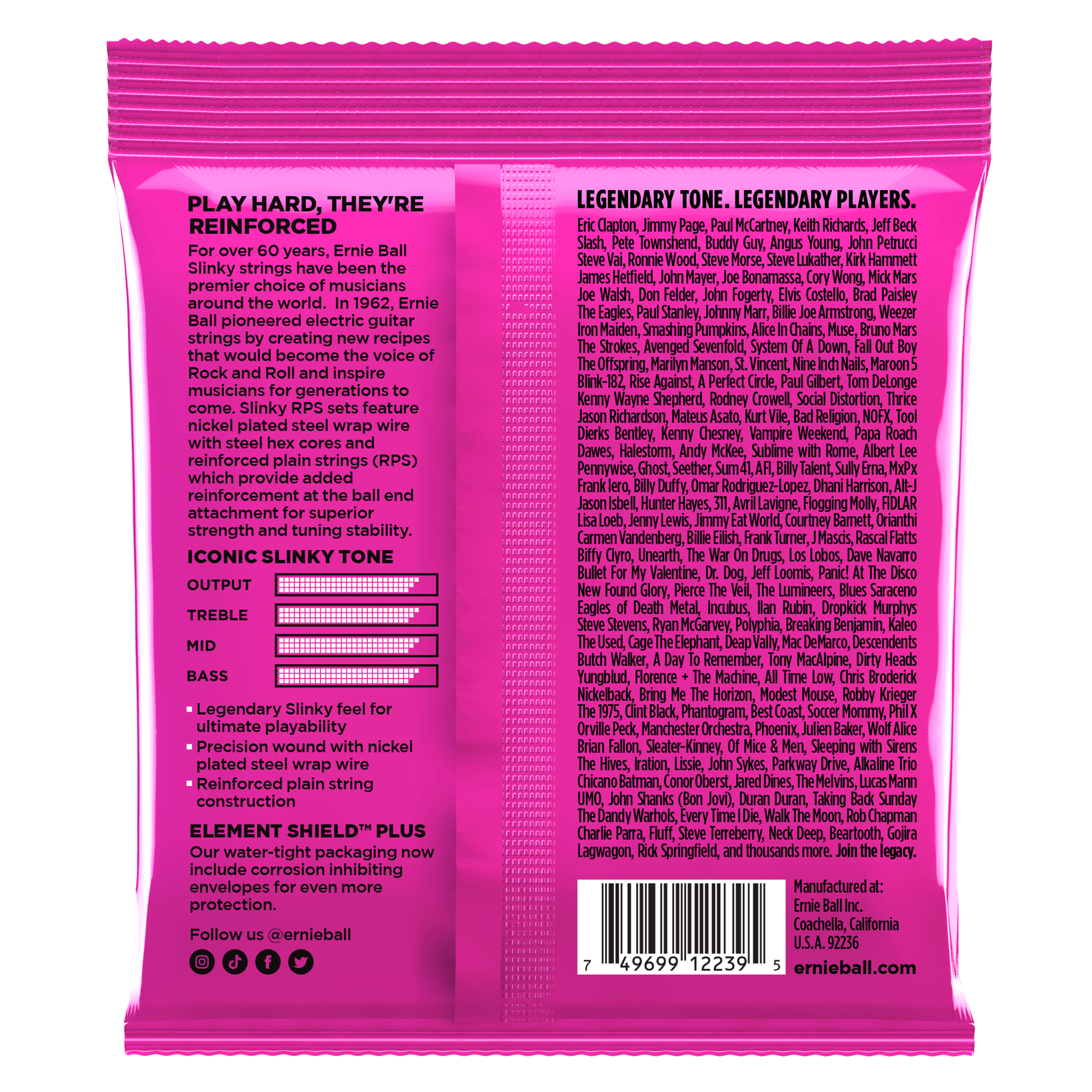 AssemblyErnie Ball single strings are coiled and packaged individually in order according to specific Slinky gauge requirements. The Slinky sets are then processed and flow wrapped in air tight individual foil packs.
