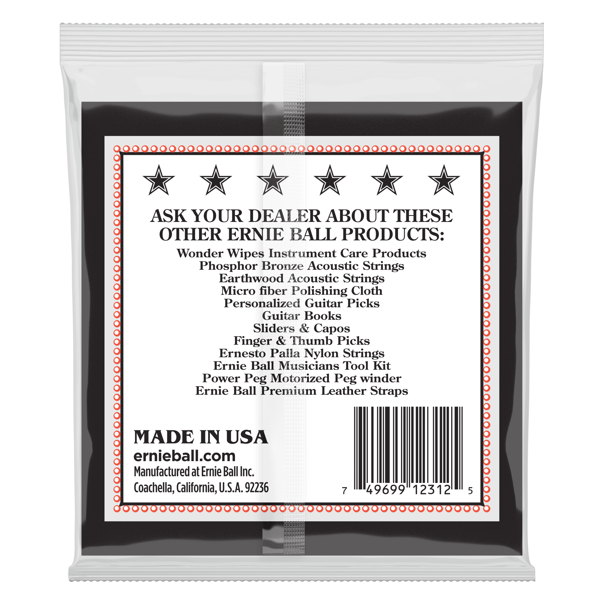 AssemblyErnie Ball single strings are coiled and packaged individually in order according to specific Slinky gauge requirements. The Slinky sets are then processed and flow wrapped in air tight individual foil packs.