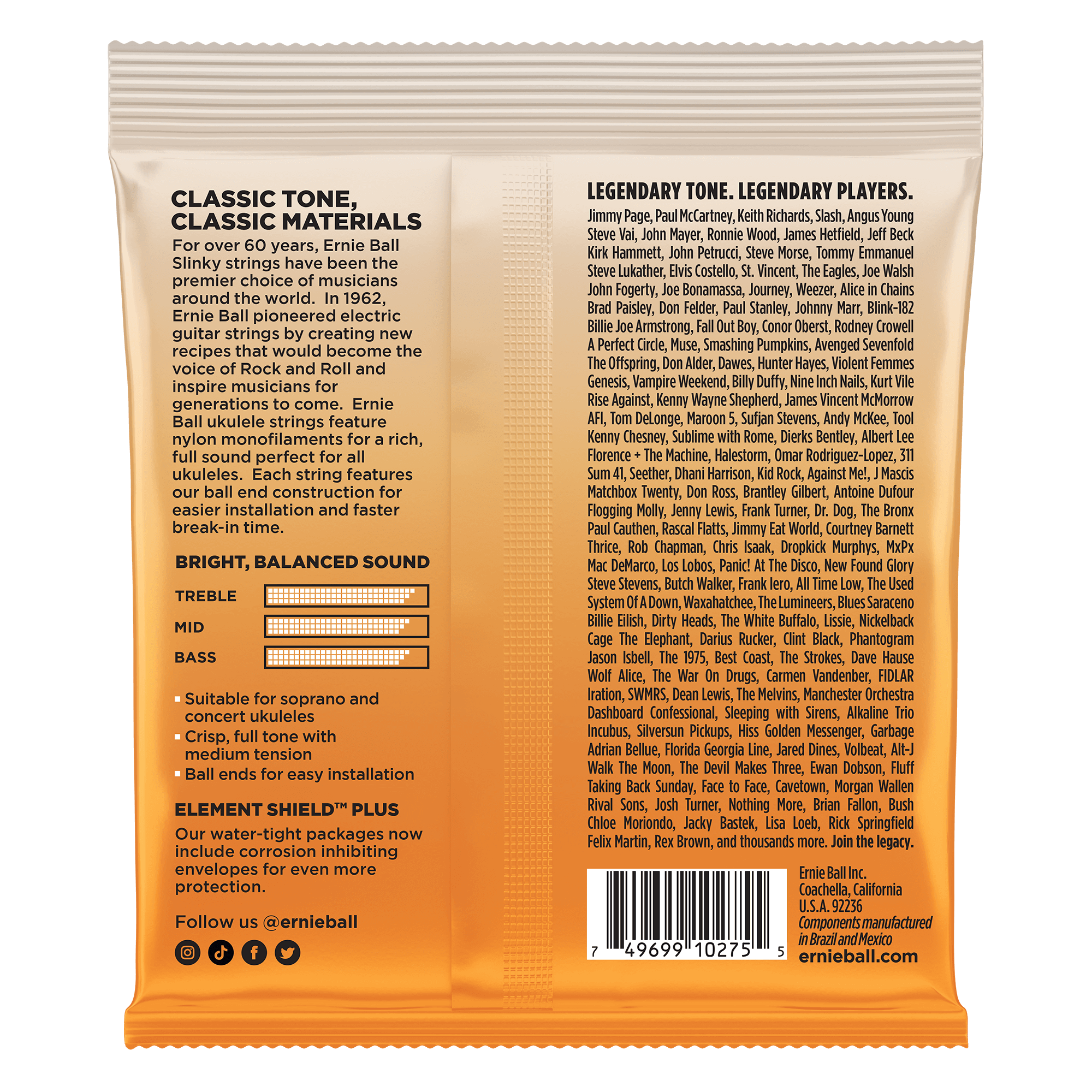 Az Ernie Ball Ukulele húrjai 100% nylonból készülnek. Tradicionális clear, áttetsző anyagú nylon a csillogó, kiegyenlített hangzást szolgálja. Az Ernie Ball Ukulele húrok bogyós véggel vannak ellátva az egyszerű húrozás, a stabil hangolhatóság és hangtartás érdekében. Koncert vagy szoprán hangszerekhez. A húrok átmérője .028 .032 .040 .028