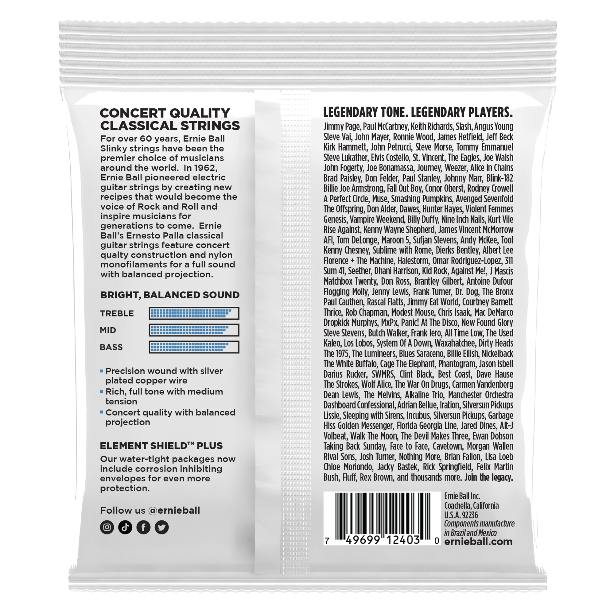 Az Ernesto Palla koncertminőségű klasszikus gitár húrok tömör nylonszálból készülnek. Az ezüst 4-5-6 húrok ezüstözött rézszálak, feltekerve egy nylon szálakból sodrott vezetőszálra (több száz vékony szálból készül). Ezáltal a húroknak selymes gazdag hangjuk van. Az összes Ernie Ball húr a preciziós gyártásnak köszönhetően megfelel a legmagasabb elvárásoknak, biztosítva ezzel a tökéletes játékérzetet optimális használhatóságot és hosszú élettartamot. Húrok átmérője .028 .032 .040 .030 .036 .042 Közepes erősségű