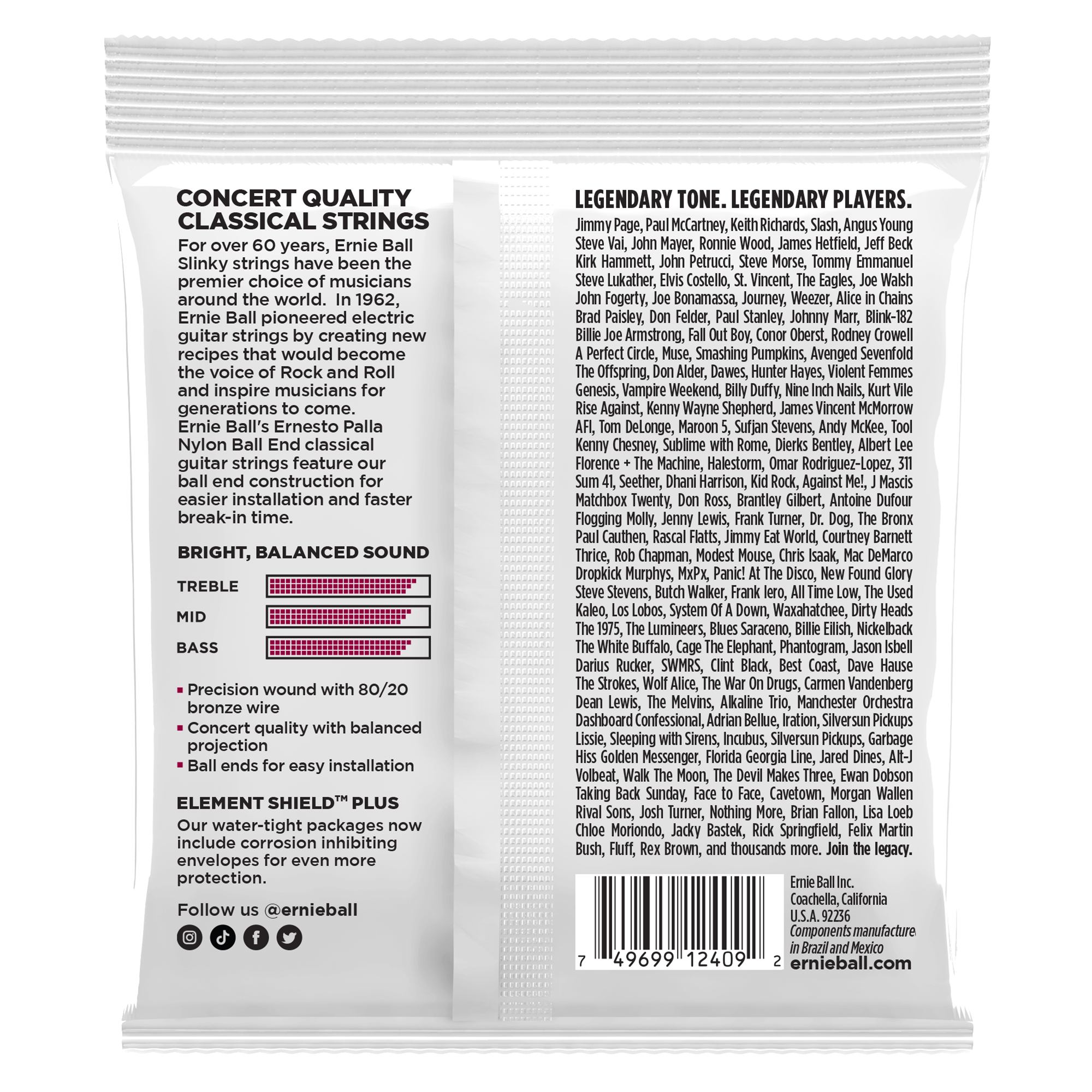 Az Ernesto Palla koncertminőségű klasszikus gitár húrok tömör fekete nylonszálból készülnek. A fekete nylon gazdagabb tisztább magasakat eredményez és felharmónikusokban gazdag hangot ad. Az arany 4-5-6 húrok 80/20 bronzbevonatú szálak, feltekerve egy nylon szálakból sodrott vezetőszálra (több száz vékony szálból készül). Ezáltal a húroknak selymes gazdag hangjuk van. Az összes Ernie Ball húr a precíziós gyártásnak köszönhetően megfelel a legmagasabb elvárásoknak, biztosítva ezzel a tökéletes játékérzetet optimális használhatóságot és hosszú élettartamot. A könnyebb és gyorsabb húrozás érdekében ezeken a húrokon található egy "bogyó" hasonlóan az akusztikus vagy elektromos gitárokon lévőkhöz, ezáltal leegyszerüsítve a húrok "megkötését" Húrok átmérője .028 .032 .040 .030 .036 .042 Közepes erősségű