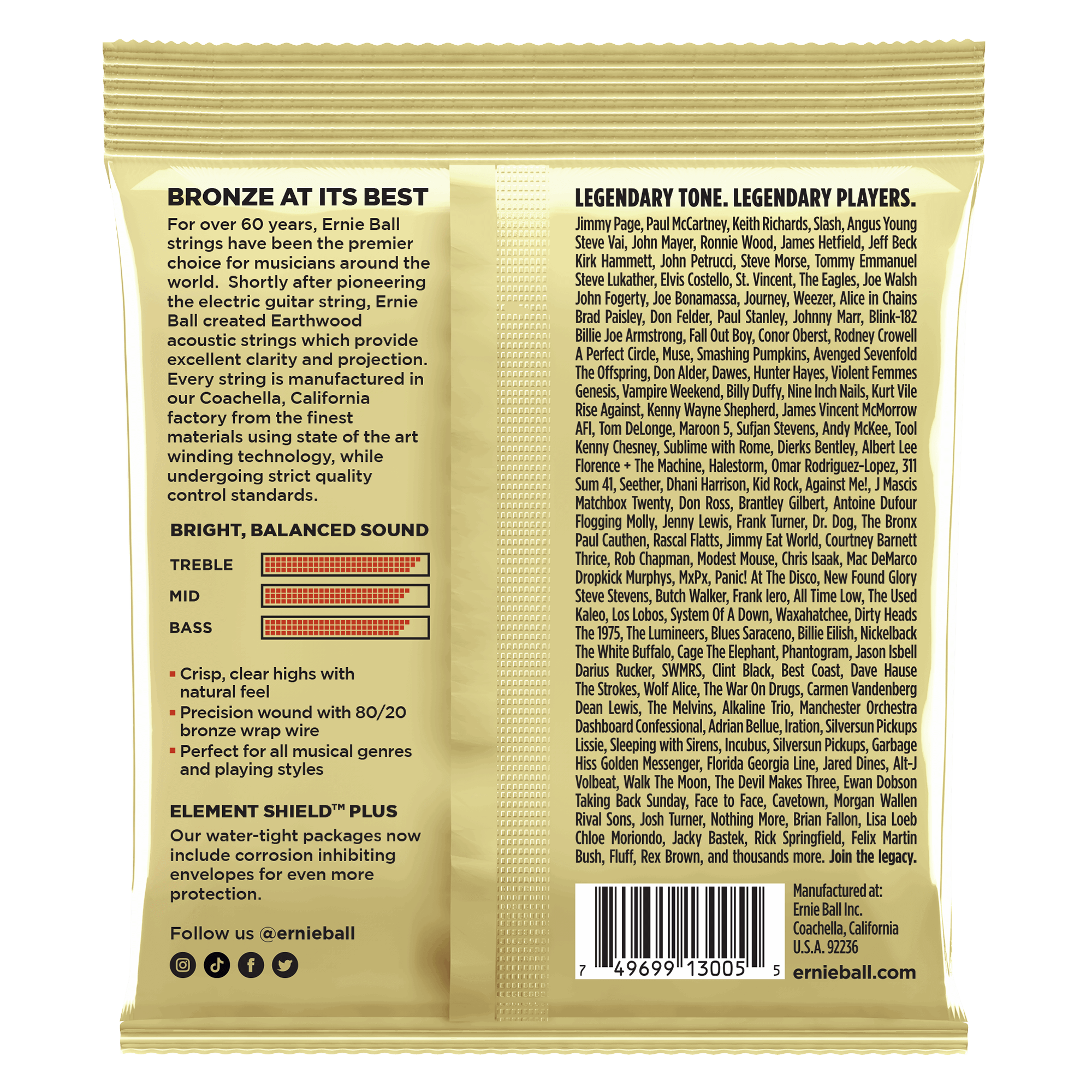 Now available in convenient three-set packs. Ernie Ball Earthwood 80/20 Bronze Acoustic Guitar Strings are made from 80% copper, 20% zinc wire wrapped around hex shaped brass plated steel core wire. These acoustic guitar strings provide a crisp, ringing sound with pleasing overtones. Gauges .012.5, .016.5 .024w, .034, .046, .056