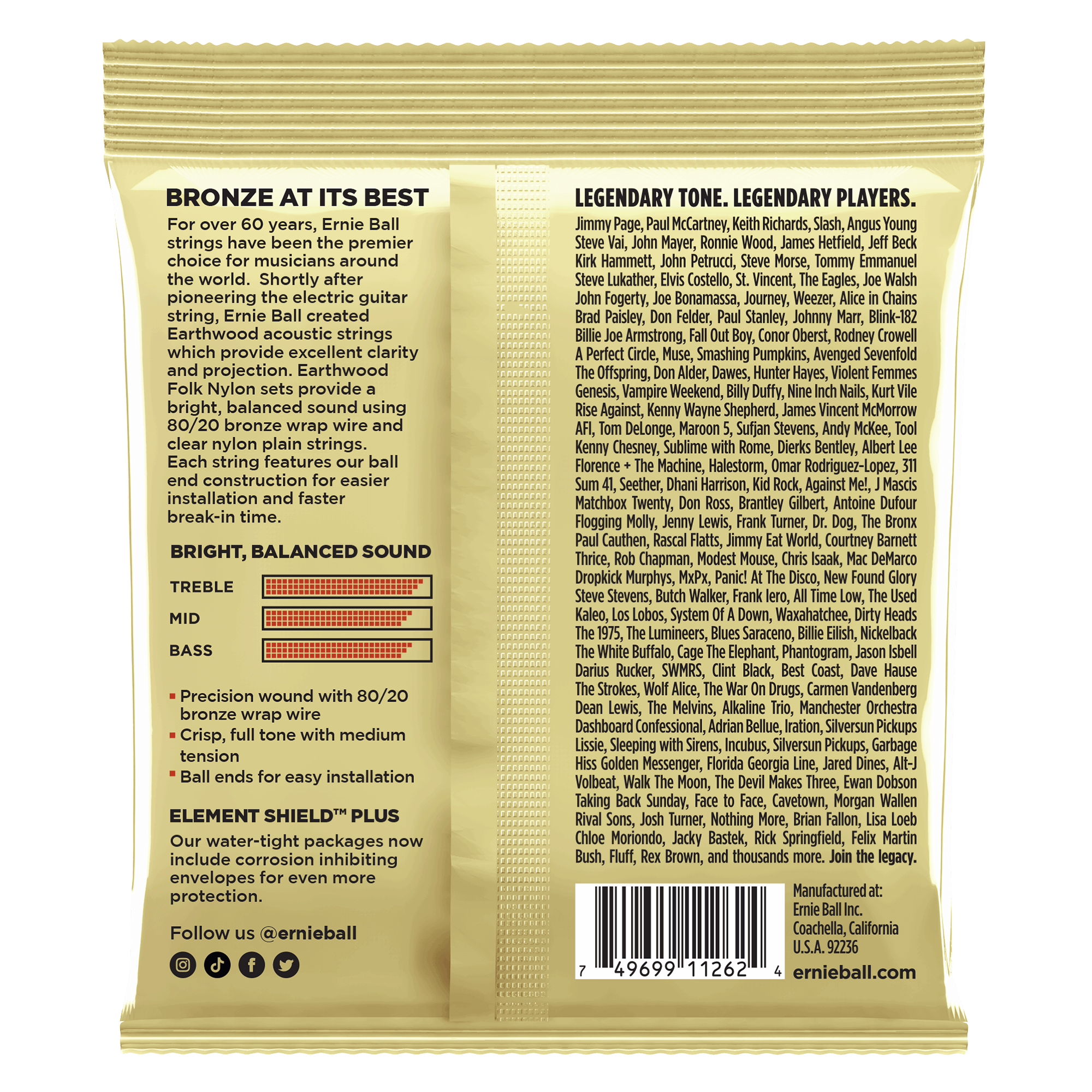 Now available in convenient three-set packs. Ernie Ball Folk Nylon acoustic guitar plain strings are made of a solid nylon clear filament. Nylon produces rich pure treble tones with percussive attack. Ernie Ball folk nylon wound strings are made of 80/20 bronze wrapped around a multifilament nylon core. The plain and wound strings both feature ball ends for faster installation. Gauges .028, .032, .040p, .030 .036 .042