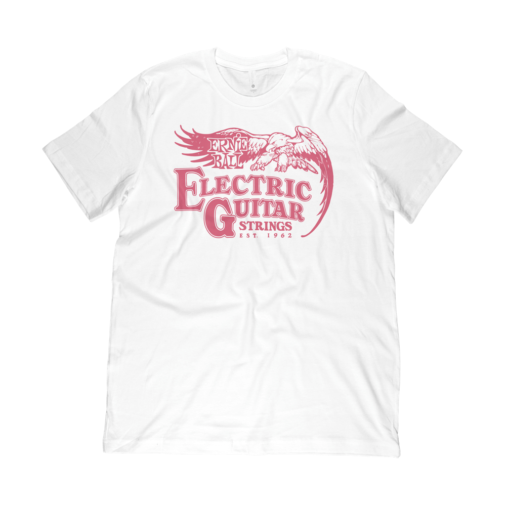 In 1962, Ernie Ball created custom gauge guitar strings that were designed specifically for bigger bends and rock'n'roll chords. Screen printed red ink on white cotton jersey t-shirt. 65% polyester, 35% combed ring-spun cotton, 3.5oz fabric.
