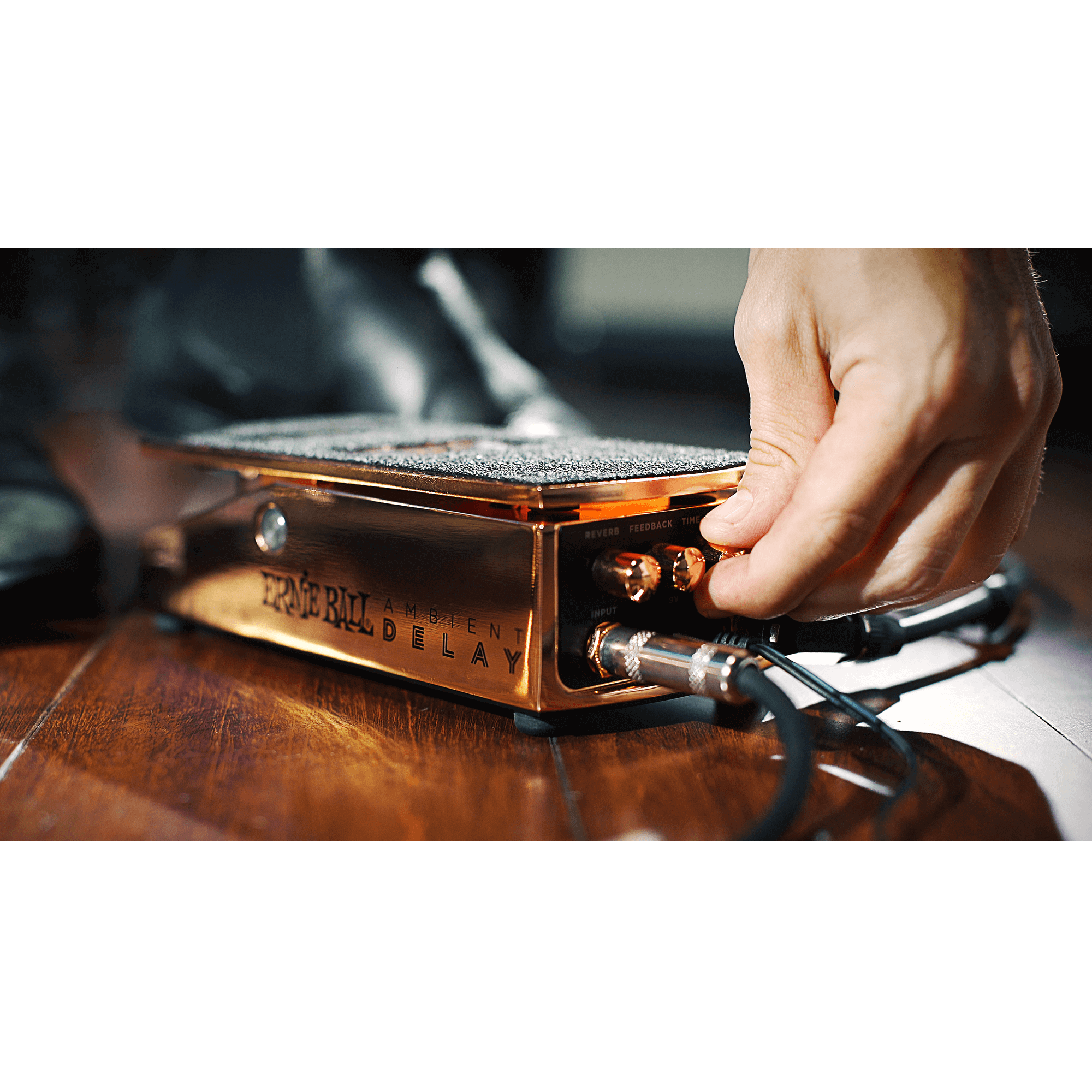 Az Ernie Ball Ambient Delay pedálja egyfajta hybridként ötvözi a digitális delay és a klasszikus zengető hangját. A delay időt 50ms és egy másodperc között tudjuk állítani. Feedback, Reverb level és az effect levelt a hangerőpedáloktól megszokott módon lábbal állíthatjuk. Egy visszafogottabb kísérőhangszínhez elegendő térhangtól a masszív visszhangos szólókig tökéletesen használható anélkül, hogy a gitárról levennénk a kezünket.
