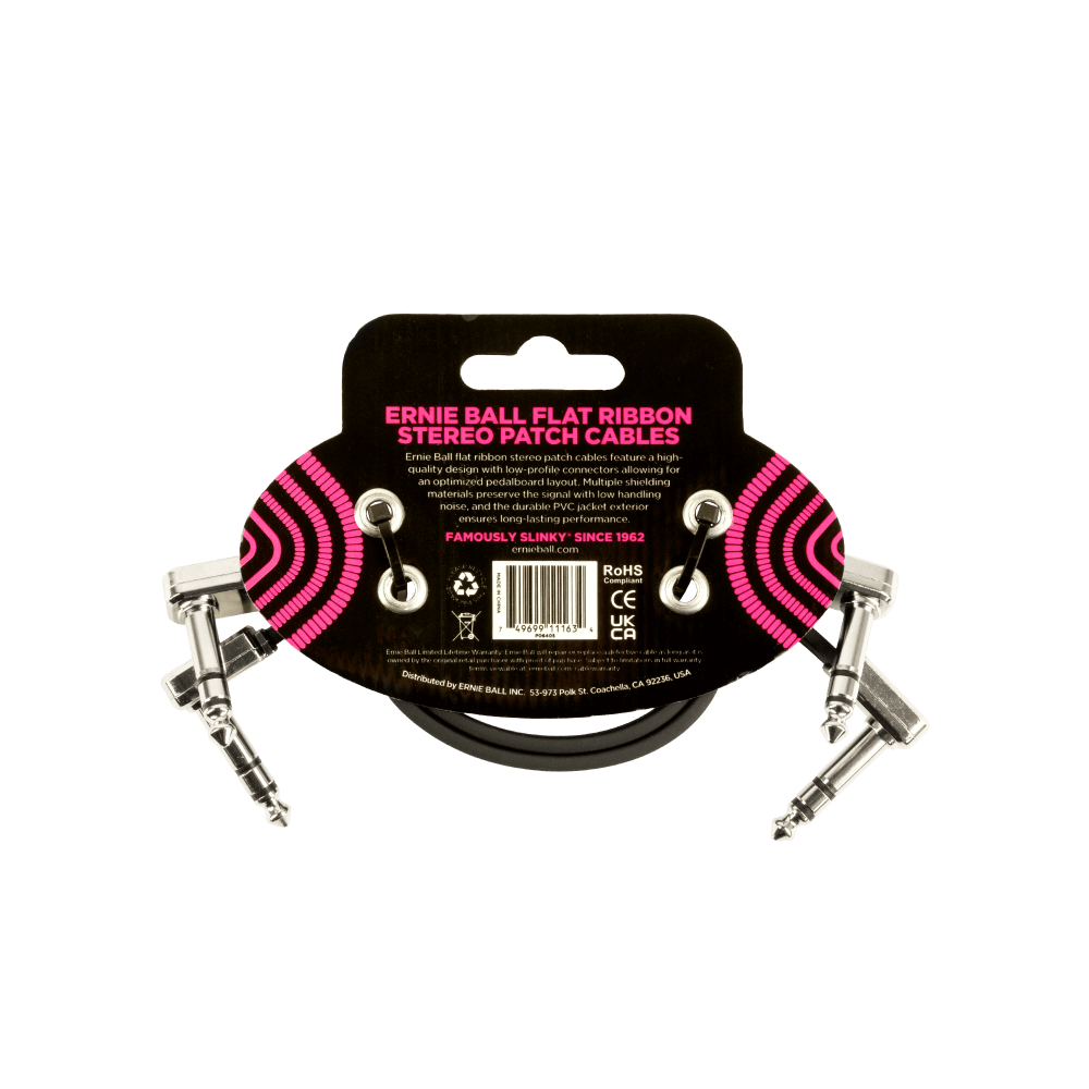 Ernie Ball Stereo flat ribbon patch cables feature a high-quality design made with superior components that are built to last. The stereo flat cable design and low-profile connectors allow for optimized pedalboard layout and cable routing, perfect for balanced and stereo patch applications that utilize a TRS connection. Multiple shielding materials preserve the signal with low handling noise, and the durable PVC jacket exterior ensures long-lasting performance.