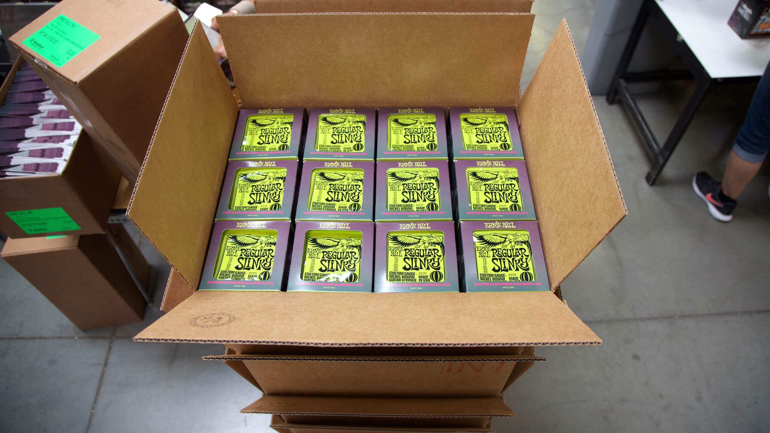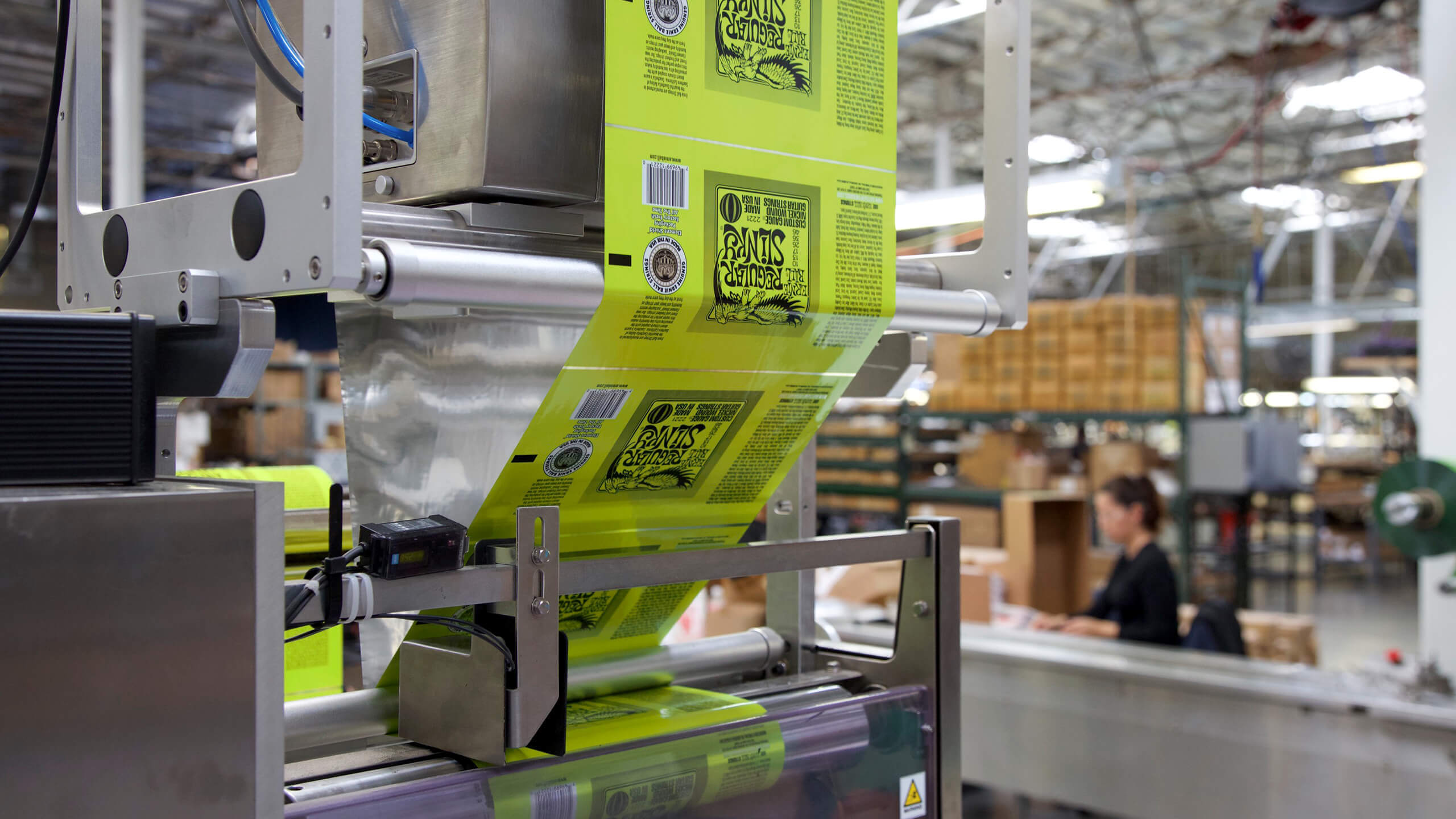 AssemblyErnie Ball single strings are coiled and packaged individually in order according to specific Slinky gauge requirements. The Slinky sets are then processed and flow wrapped in air tight individual foil packs.